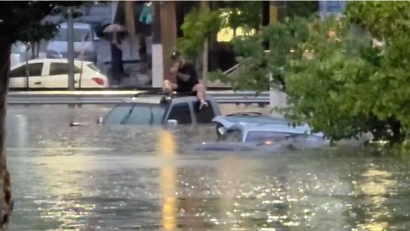 Homem sobe em carro para escapar de alagamento em SP; veja vídeos
